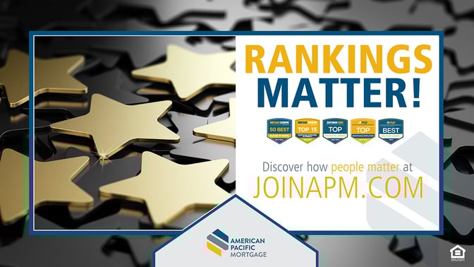 We are proud to share that American Pacific Mortgage has moved up to #12 in the Scotsman Guide Top Mortgage Lender rankings, up two spaces from last year!